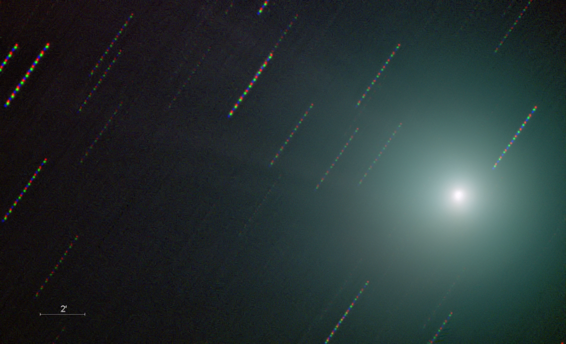 07.01.2015, 19:36 - 19:55 UT, RGB je 8 x 30sec gestackt in Bewegungsrichtung des Kometen