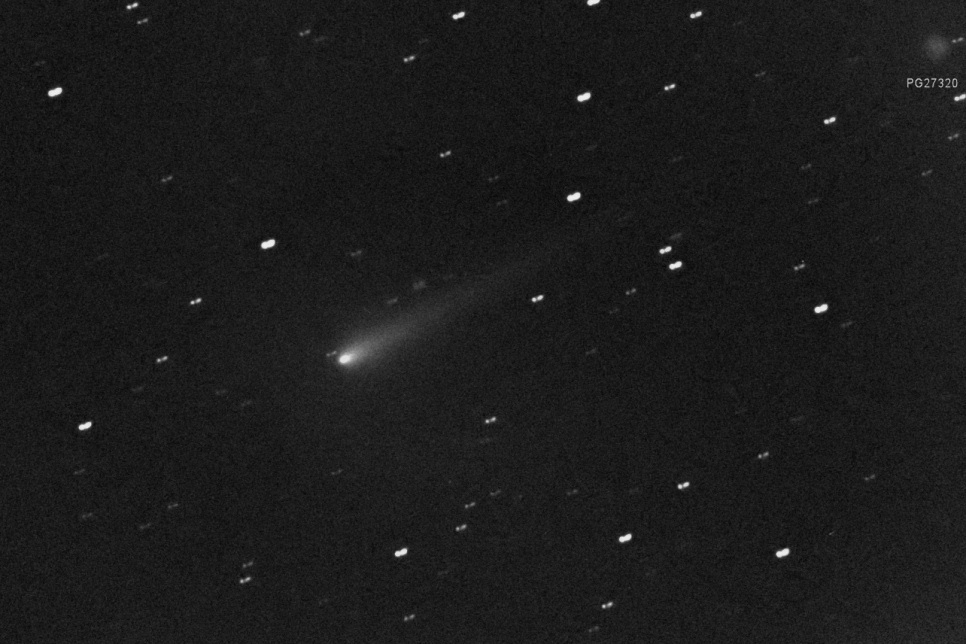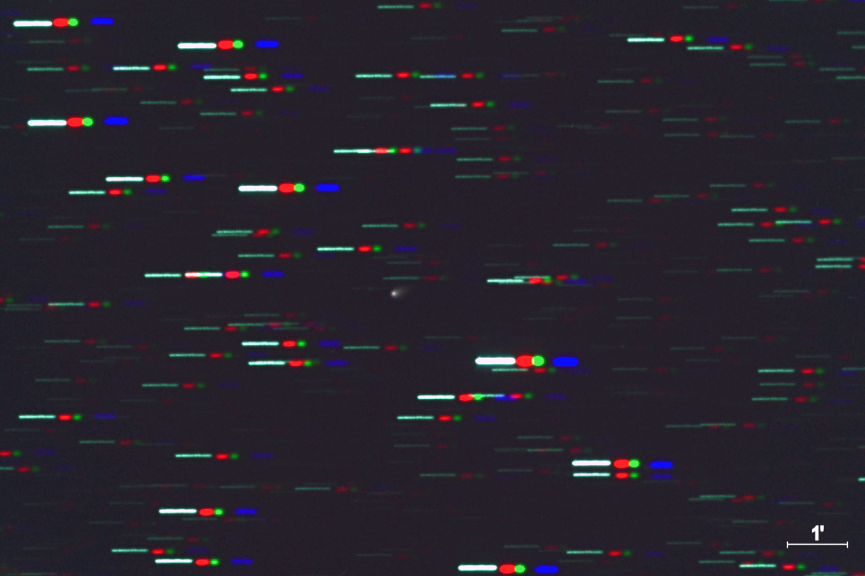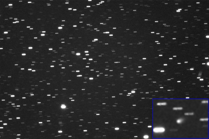 Entfernung vom Heimatplaneten: 4.02302572 AE (601,836,081 km) Abstand von Sonne r 4.90631 AE relative Geschwindigkeit: 34.700"/Stunde, Positionswinkel 272.2 Helligkeit 15.9 Mag