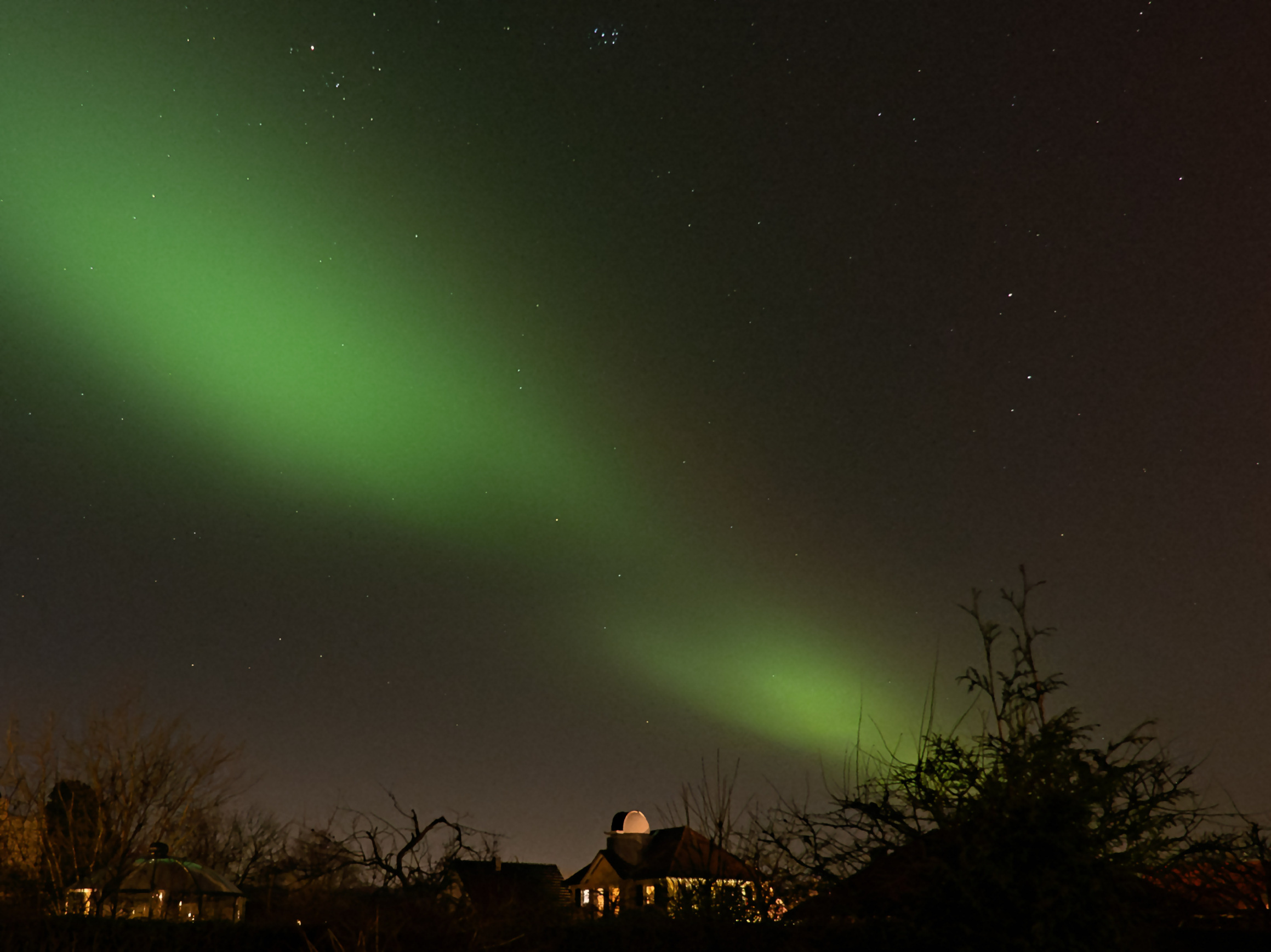 20.01.26 18:30 UTC I OP Potsdam, Horizontblick Richtung Norden, Sony A7IV + Objektiv Sony24mm F4 10sec, ISO1250 In der nachfolgenden Animation aus 54 Einzelaufnahmen entstand ein Zeitraffer von 18:19 bis 18:37 UTC ![]() ![]() Das gab es auch zum ersten mal. Polarlichter über der IOP-Kuppel. Besten Dank an meinen lieben Nachbarn, Harald Pfeiffer. Olympus EM1 Mark III; Panasonic 7-14mm f/4. 4 Sekunden bei 7mm, f/4, ISO 3200. |