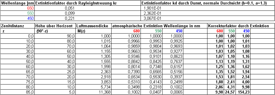 Bekannter Weise werden die kurzwelligeren Spektralanteile stärker gestreut und gedämpft, was uns einerseits einen blauen Himmel, aber auch das Abend- und Morgenrot beschert und als Extinktion durch Rayleigh-Streuung und Dunst-Extinktion beschrieben wird. Der funktionale Zusammenhang ist ausführlich in [4] beschrieben. In der nachfolgenden Tabelle habe  ich Extinkionswerte für  verschiedene Höhen über dem Horizont, bei einer normalen Durchsicht (b=0.1, a=1.3) berechnet. Als Wellenlängen wurden angenähert die Mitten der Spektralfenster von Bild 3 R[680nm], G[550nm], B[450nm] verwendet. Dies deckt sich annähert mit dem standardisierten astronomischen Farbsystem UBVRI [366, 440, 553, 700, 880nm].