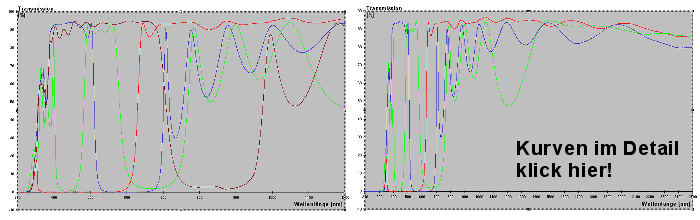 Für RGB-Aufnahmen verwende ich den Filtersatz von "True Technology Ltd., Woodpecker Cottage Red Lane, Aldermaston (UK)", der sich wie alle Interferenzfiltersätze durch steile, scharf begrenzte, spektrale Fenster auszeichnet und dementsprechend nur die gewünschten Farbbereiche passieren lässt. Mit einem Spektrographen wurden dann nachfolgende Transmissionskurven ermittelt (Bild 1). Neben den 3 RGB-Filtern ist noch der Durchlass-bereich des Infrarotsperrfilters (braun) dargestellt.