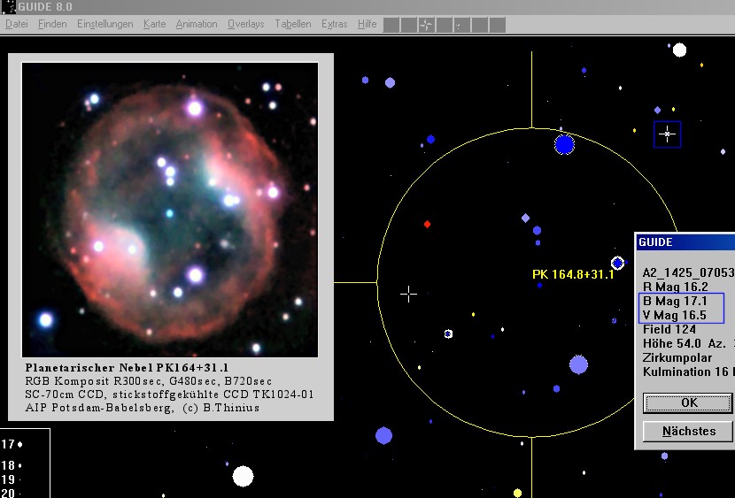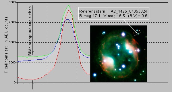 In der Beispielaufnahme des Planetarischen Nebels PK164+31.1 wurde im Gesichtsfeld der sonnenähnliche Stern A2_1425_07053824 (B-V) = 0.6 als Weißreferenz ausgewählt.
