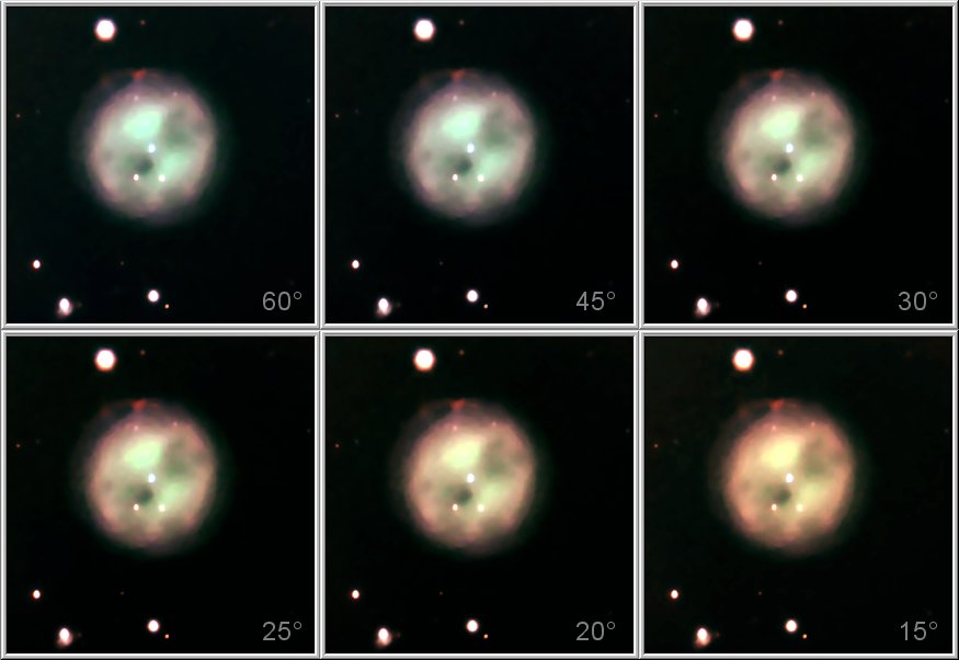 Im Bild 5 ist einmal der reine Einfluss durch Extinkion veranschaulicht, wie er sich auf den Eulennebel M97 auswirken würde, hätte ich ihn mit gleichen Belichtungszeiten mit unterschiedlichen Höhen über dem Horizont aufgenommen.