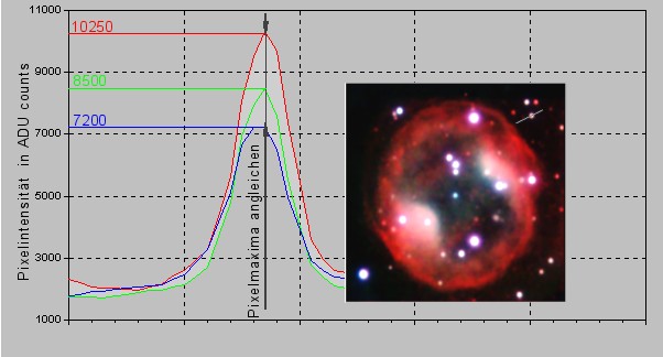 In einem ersten Bildbearbeitungsschritt müssen die Hintergrundhelligkeiten der 3 Farbbilder durch eine geeignete Offsetaddition auf ein Niveau angeglichen werden, um die wirklichen Intensitätsmaxima auszumessen.