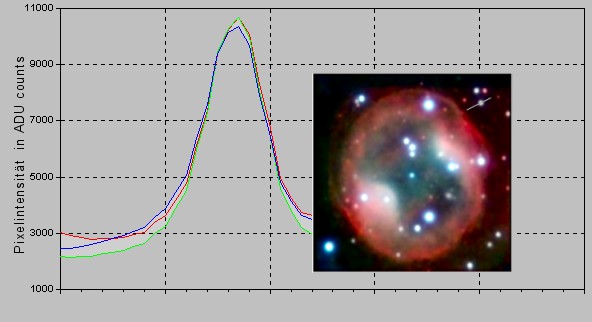 Im Ergebnis dieser RGB-Farbkorrektur erscheint unser Referenzstern als weißes Objekt und der Planetarische Nebel so, wie wir ihn mit bloßem Auge sehen würden.
