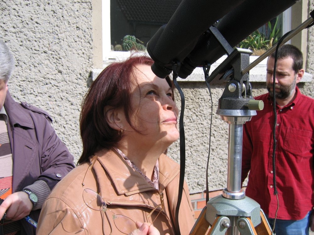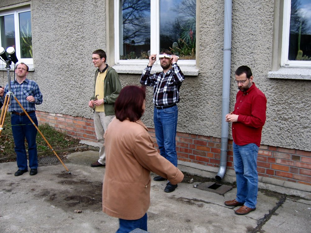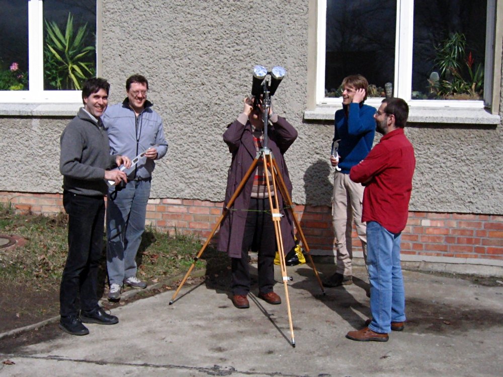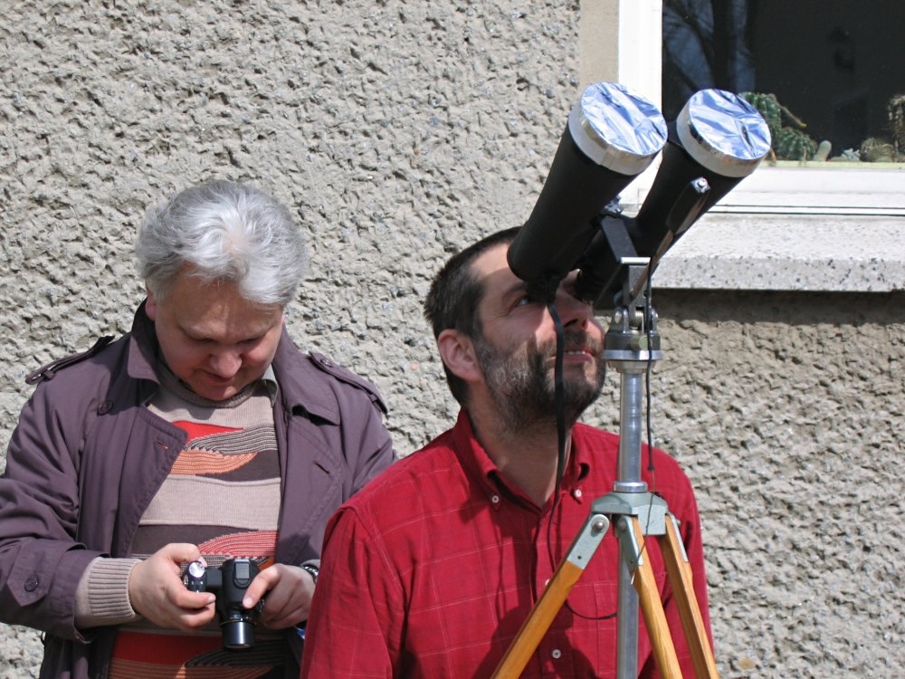 Mitarbeiter auf unserem Firmengelände der TOSS GmbH Potsdam.  Fotos mit Digitalkamera Canon PowerShot A95(5MegaPix), frei Hand hinter dem 15x80 Feldstecher mit Sonnenfilterfolie.