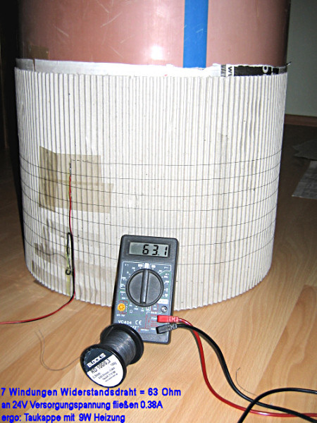 | Nachtrag 15.12.2007 9W reichen für die 14" Taukappe nicht aus! Eine zusätzliche Windungsschicht nahe der Schmidtplatte lassen jetzt bis zu 24W, je nach Versorgungsspannung zu.