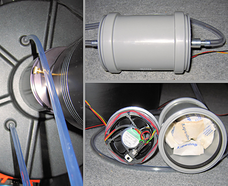 | Zeitung und Wellpappeschichten, getränkt mit wasserfestem Holzkaltleim werden Schicht für Schicht auf ein Wasserrohr Durchmesser 40cm laminiert. Alufolie dient als Trennschicht, damit man das Ganze später auch wieder vom Rohr runter bekommt. | Ein PC-Lüfter saugt Luft über einen Silikonschlauch aus dem Teleskopinnenraum an und leitet diese über etliche Tüten Trockenmittel zurück ins Teleskop. Über einen Feuchtefühler kann die aktuelle relative Luftfeuchte gemessen werden. Die verwendeten Löcher im Tubus sind die Gewindelöcher der ehemaligen Schrauben zur Spiegeltransportsicherung. |